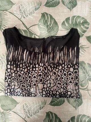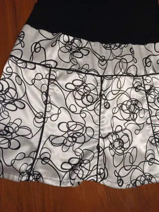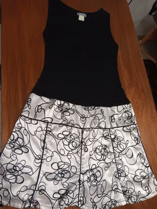 Vestido de tela fina con un diseño elegante. - Parte superior negra sin mangas. - Falda con estampado abstracto en blanco y negro. - Detalle de costuras en la falda.