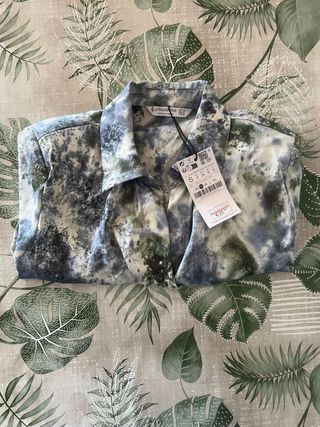 Vestido con un diseño original y llamativo. - Estampado abstracto en tonos azules y verdes. - Cuello camisero. - Manga larca. - Raso y con hombreras Con etiqueta! No ha sido usado nunca.