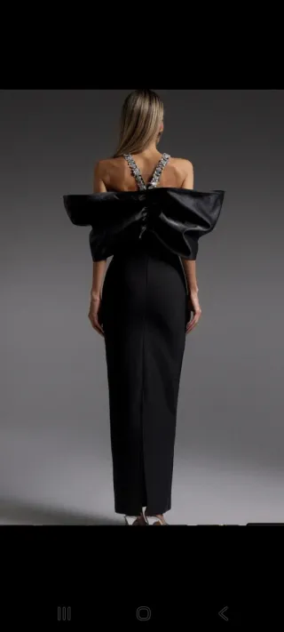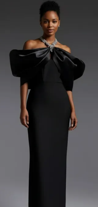 Elegante vestido largo con un diseño sofisticado. - Cuello halter. - Mangas abullonadas. - Corte ceñido.