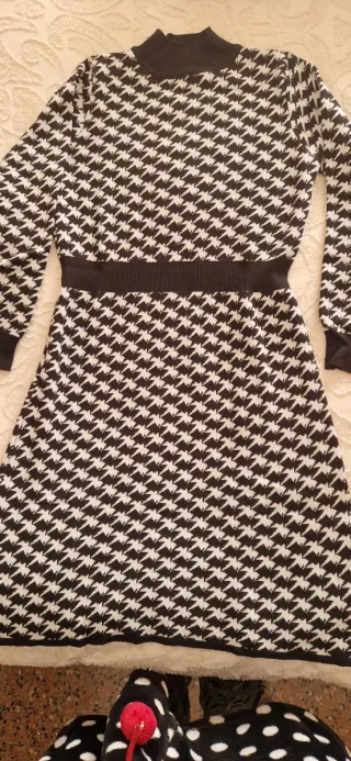 Precioso vestido de punto con estampado de pata de gallo. - Diseño de cuello alto. - Cintura marcada. - Manga larga.