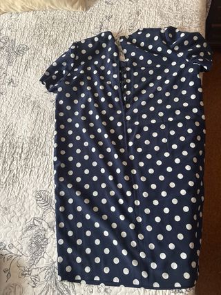 Vestido de corte recto con estampado de lunares. - Diseño de lunares blancos sobre fondo azul marino. - Cuello cuadrado con detalle de volantes y botones. - Manga corta.