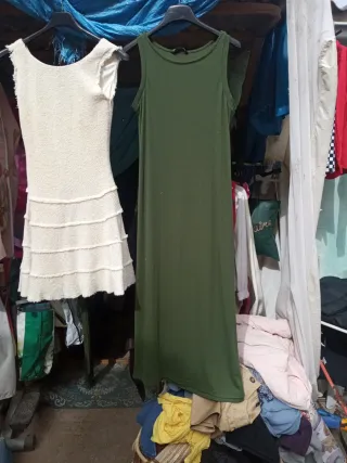 Lote de dos vestidos de verano. - Vestido beige con textura y volantes. - Vestido verde liso de tirantes.mas ropa de regalo extras