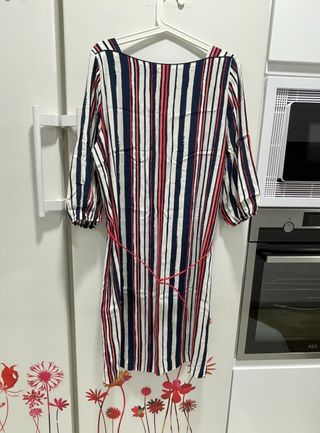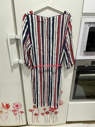 Vestido de rayas verticales con cinturón rojo a juego. El escote es cuadrado y las mangas son tres cuartos. • Tejido cómodo y ligero 100% viscosa • Cinturón fino • Con forro interior • Cremallera en la espalda • Media manga holgadas que se sujeta al brazo con el elástico • Perfecto estado. Sin usar