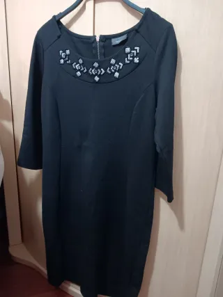Elegante vestido negro con detalles de pedrería en el escote. - Diseño con pedrería geométrica. - Cremallera trasera. - Manga tres cuartos.
