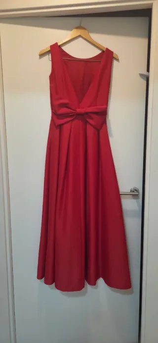 Elegante vestido rojo largo, ideal para eventos especiales. - Diseño sin mangas. - Escote en V en la espalda. - Falda con pliegues.