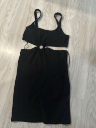 Vestido negro con un diseño moderno y atrevido. - Abertura central con detalle de aro. - Tirantes finos. - Tejido texturizado.