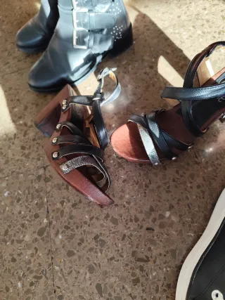 Elegantes sandalias de vestir, perfectas para cualquier ocasión especial. Su diseño combina detalles en negro y marrón, aportando un toque sofisticado. - Tacón de madera. - Tiras finas en la parte delantera. - Correa ajustable al tobillo.
