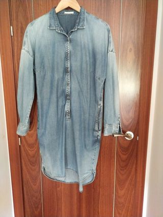 vestido vaquero, bajo redondeado un poco más largo por detrás, bolsillos laterales, manga caída. se le han cortado un poco las mangas por ser muy larga. la tela vaquera es fuerte