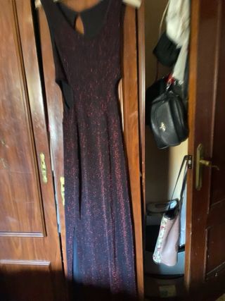 Vestido largo con un diseño llamativo y elegante. - Tejido con brillos rojos. - Corte en la cintura. - Abertura en la pierna.