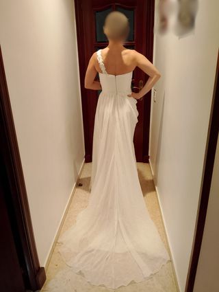Elegante vestido de novia Pronovias, de color blanco y con un diseño de un solo hombro. 1 uso. - Diseño de un solo hombro con detalles. - Cuerpo drapeado. - Falda con caída y cola.