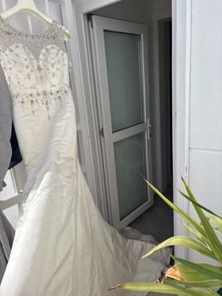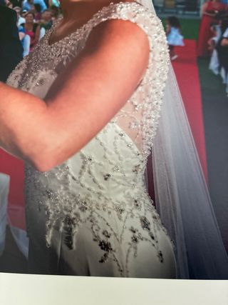 Elegante vestido de novia con detalles en pedrería y una silueta sirena. - Diseño de espalda descubierta. - Acabado satinado. - Cola pronunciada.