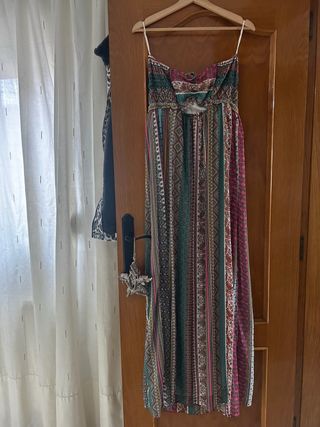 Vestido largo con un estampado vibrante y llamativo. Ideal para ocasiones casuales o eventos de verano. - Diseño sin tirantes. - Cintura elástica con detalle. - Largo hasta los tobillos.