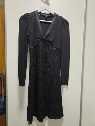 Elegante vestido negro de manga larga con detalles de encaje. - Cuerpo superior con escote en V y lazada. - Falda de encaje con forro. - Mangas largas ajustadas. - Ribete satinado en el escote y cintura.
