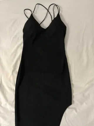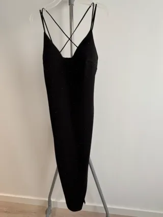 Vestido elegante con un toque de brillo. - Diseño con tirantes finos. - Pierna con abertura. - Tejido con brillantina.