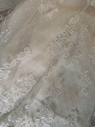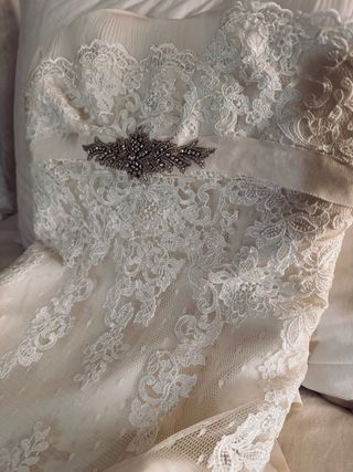 Elegante vestido de novia de la colección Manuel Mota de Pronovias. Un diseño sofisticado y romántico (precio original 2.400 euros) - Encaje intrincado. - Detalle de pedrería en el cinturón. - Cola de encaje larga. - Limpiado en tintorería.