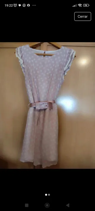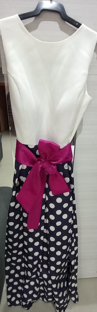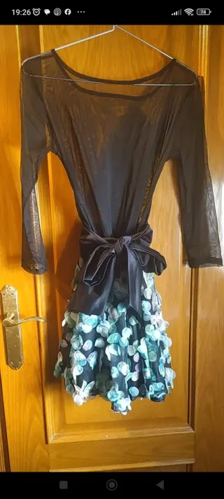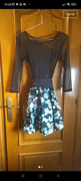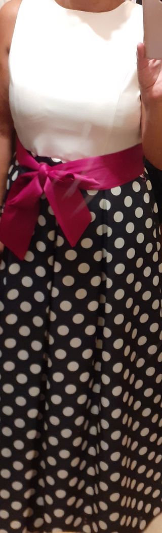Vestido con un diseño elegante y llamativo. Puesto 1 sola vez - Cuerpo superior de tejido transparente. - Cinturón de lazo negro. - Falda con círculos cosido
