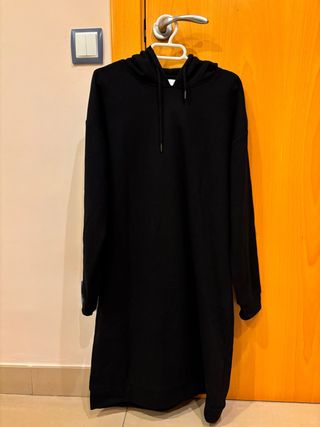 Vestido negro de estilo casual con capucha. - Diseño de manga larga. - Cordones ajustables en la capucha. - Corte holgado.