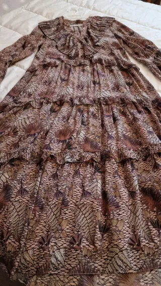Vestido con un bonito estampado floral en tonos beige y marrón. Tiene un diseño con volantes en el cuello y mangas largas. - Cuello con volantes. - Mangas largas. - Estampado floral.