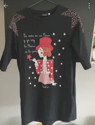 Vestido negro de algodón con un diseño original de Annabel Lee. - Estampado de circo con una figura femenina y estrellas. - Detalles de pedrería en los hombros. - Frase La vida es un Circo y yo soy la Reina de la pista. - Con bolsillos laterales.