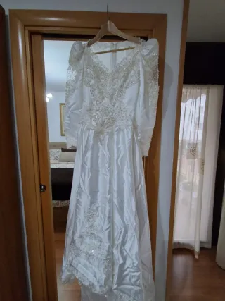 Elegante vestido de novia clásico, con inspiración vintage de los años 80 y 90 con detalles de pedrería y manga larga. - Materiales: Satén y encaje, con adornos de abalorios y pedrería. Características: Mangas largas abullonadas con puños de encaje. Corpiño estructurado con cuello alto y detalles bordados. Falda voluminosa que cae en una cola. Cierre de botones en la espalda. Con cancán y velo