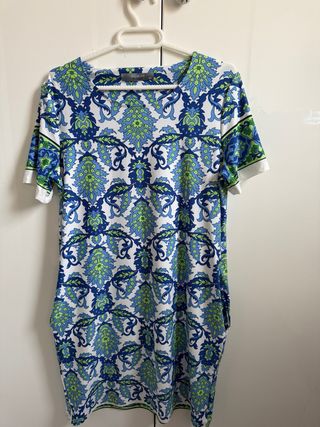 Vestido de verano con un estampado vibrante y llamativo. - Diseño de manga corta. - Corte recto y cómodo. - Ideal para días cálidos.