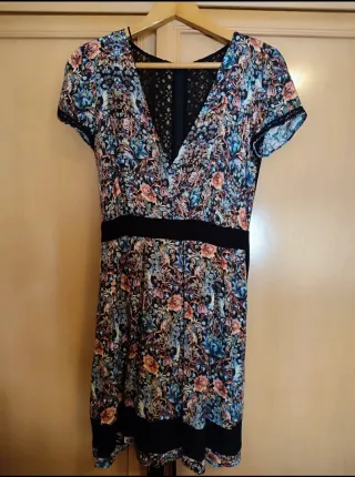 Vestido corto Naf Naf con un estampado vibrante y detalles en negro. - Escote en V pronunciado. - Cintura marcada con banda negra. - Mangas cortas con detalle de encaje. - Bajo con banda de encaje negro.
