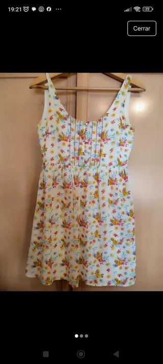 Vestido de Sfera con un bonito estampado floral en tonos verdes y morados. Ideal para entretiempo. - Diseño sin mangas. - Escote en V con detalle. - Bajo con banda estampada.