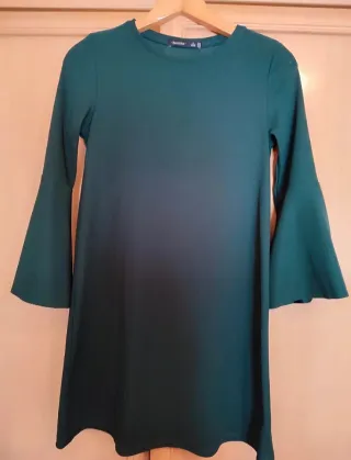 Vestido de manga acampanada. - Color verde intenso. - Diseño moderno y favorecedor.