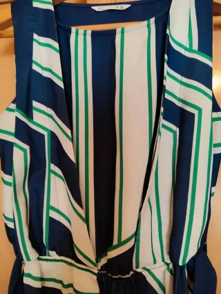 Vestido de manga larga con rayas azul plateadas y negras. - Diseño con abertura lateral. - Tejido ligero y brillante.