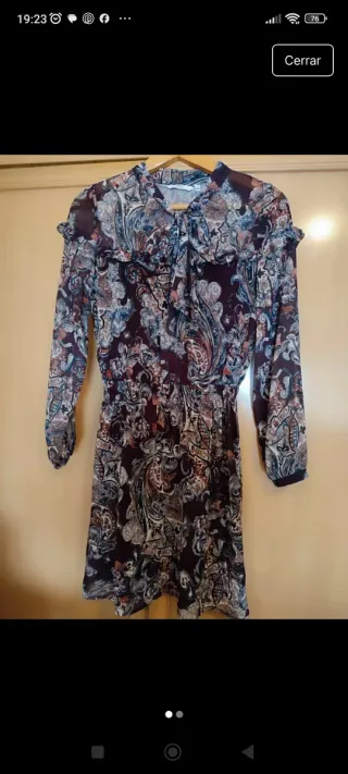 Vestido de manga larga con un bonito estampado. - Diseño con lazada en el cuello. - Cintura elástica. - Tejido ligero y vaporoso.