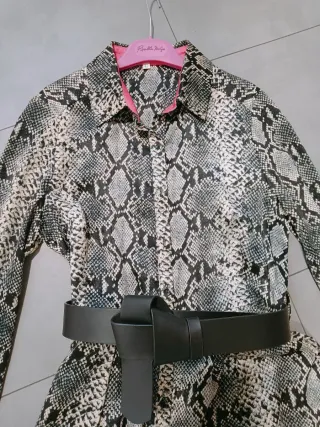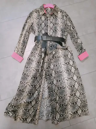Vestido largo camisero con estampado de serpiente y detalles en rosa. - Manga larga. - Cuello camisero. - Cinturón negro incluido. - Puños y cuello interior en color rosa. - Tiene bolsillos - Sirve también para llevarlo abierto como abrigo ligero encima de un vaquero y una camiseta básica.