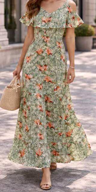 Vestido largo de verano con un diseño cruzado en la parte superior. - Diseño cruzado en el escote. - Largo hasta los tobillos. - Ideal para climas cálidos.
