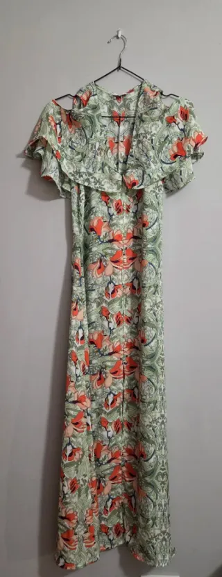 Elegante vestido largo de la marca Goa Goa, perfecto para eventos especiales. - Diseño con volantes en las mangas y cuello alto. - Cintura marcada con fajín. - Falda con varios volantes y caída fluida. - Estampado abstracto en tonos vibrantes. Medidad de hombro a hombro 36 cm, de hombro a largo 137 cm.