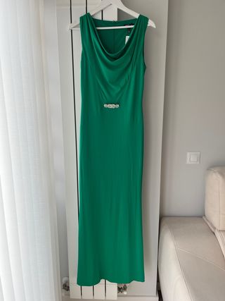 Elegante vestido largo de color verde, perfecto para ocasiones especiales. Presenta un detalle de pedrería en la cintura que añade un toque de brillo. Diseño sin mangas y escote drapeado, se adapta perfectamente al cuerpo porque es elástico. Tiene forro interior. 150cm de largo aproximadamente. Sin estrenar, conserva la etiqueta.