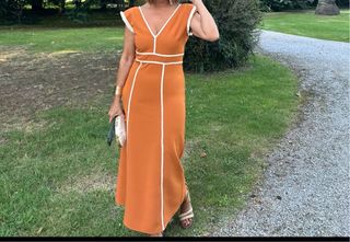 Elegante vestido largo en color naranja, ideal para bodas o eventos especiales. - Diseño con detalles blancos. - Corte favorecedor. - Largo hasta los tobillos.