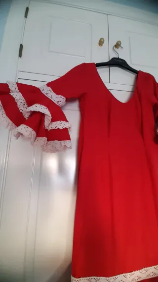 Vestido de flamenca de color rojo, ideal para ferias y romerías. Presenta un diseño con múltiples volantes y detalles de encaje blanco. - Mangas acampanadas con volantes y encaje. - Cuerpo ajustado. - Falda con varios volantes escalonados. - Adornos de encaje blanco en los volantes y en la cintura.