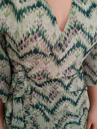 Vestido cruzado de la marca Noon con un estampado brillante - Diseño cruzado. - Estampado multicolor con tonos verdes y rosas. - Tejido con hilo brillante.