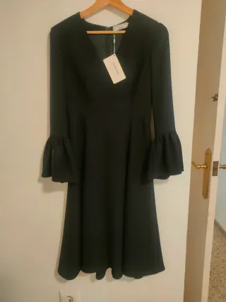 Vestido de Dolores Promesas, sin estrenar. Diseño elegante con mangas acampanadas. - Corte favorecedor. - Tejido con textura sutil. - Cierre de cremallera en la espalda.