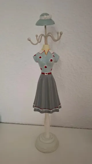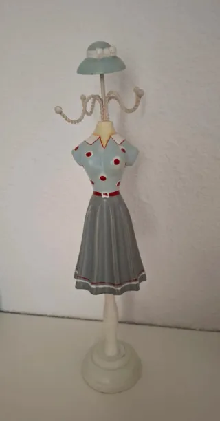 Original joyero con forma de vestido, perfecto para organizar tus joyas. - Diseño de vestido vintage. - Incluye un sombrero decorativo. - Colgador para collares y pulseras.