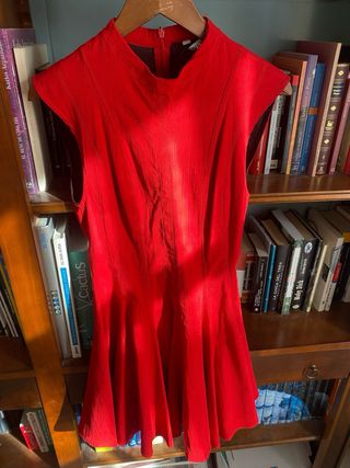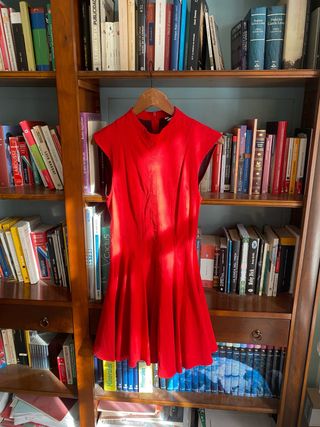 Elegante vestido de cóctel en color rojo, con cinturón a juego. - Diseño con mangas largas. - Cinturón con detalles en negro y hebilla dorada.