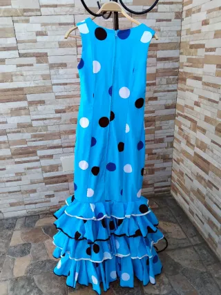 Vestido de flamenca con un diseño alegre y llamativo. - Estampado de lunares blancos sobre fondo azul. - Mangas abullonadas con volantes. - Volantes en cascada a lo largo de la falda. - Adornado con detalles en color rojo.