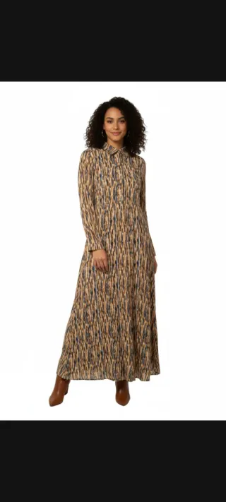 Vestido largo con un estampado único y llamativo. - Diseño de cuello camisero. - Manga larga. - Largo hasta los tobillos.