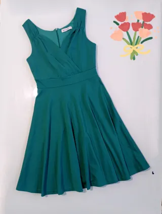 Vestido con un favorecedor escote cruzado en pico, bonito color verde mar azulado. - Diseño sin mangas. - Cintura marcada. - Falda con vuelo evasé. Marca Grace Karin, talla S, para una M también bien. Mira mi perfil, puede que te guste algo más.