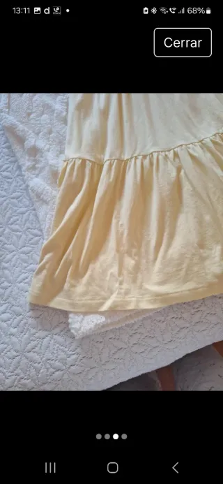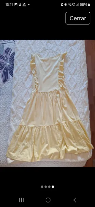 Vestido de mujer con un diseño ligero y fresco. - Color amarillo claro. - Mangas con volantes. - Falda con volantes en varios niveles.