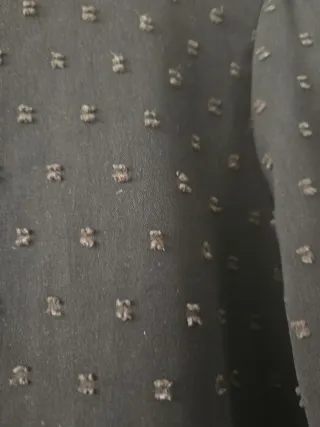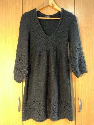 Vestido de punto suave de H&M, color negro, con detalle calado en mangas y bajo. Muy cómodo y perfecto para otoño/invierno. Escote en V y manga 3/4. 📌 Importante: En buen estado general, con algún signo leve de uso propio del tejido (ver fotos), sin enganchones importantes. Estado: Bueno Talla: XS (yo ocupo M y me va bien) Color: Negro Detalles: Punto calado, corte suelto y cómodo