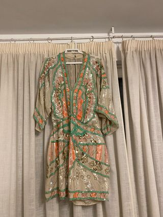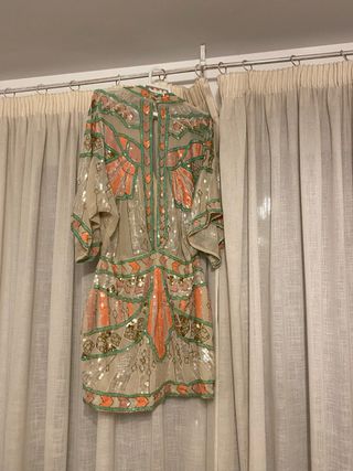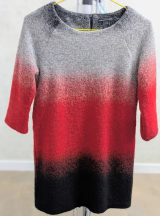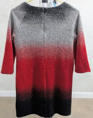 Vestido corto de Mango con un diseño degradado muy llamativo. Composición en lana, acrílico y poliéster. Manga tres cuartos. Cuello redondo y cremallera oculta trasera. Pequeña abertura en la parte de atrás. Totalmente forrado. Como nuevo.