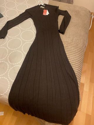 Vestido largo de punto acanalado con cuello en V y mangas largas abullonadas. - Tejido suave y elástico. - Diseño de canalé vertical. - Corte acampanado.