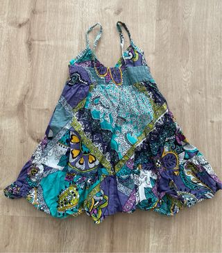 Vestido veraniego con un diseño vibrante y colorido. - Estampado patchwork con motivos florales y geométricos. - Tirantes finos. - Detalle de volante en el bajo. - Cierre de cordones en la parte delantera. Talla 4 / Marca Xcess