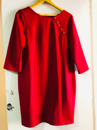 Vestido en color rojo, ideal para diversas ocasiones. - Diseño con cuello redondo. - Detalle de botones dorados en la zona del hombro. - Manga tres cuartos.
