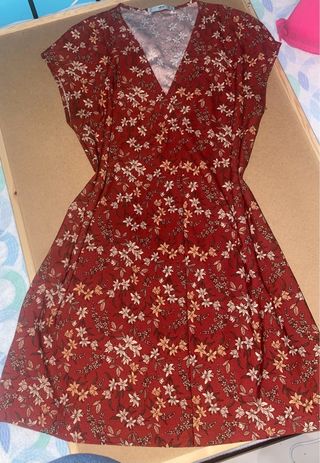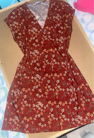 Vestido de Mango con estampado floral en tonos rojizos y blancos. Diseño con escote en V y manga corta. - Estampado de flores y hojas. - Escote cruzado. - Manga corta. - Corte evasé. Es ancho por lo que va para talla M